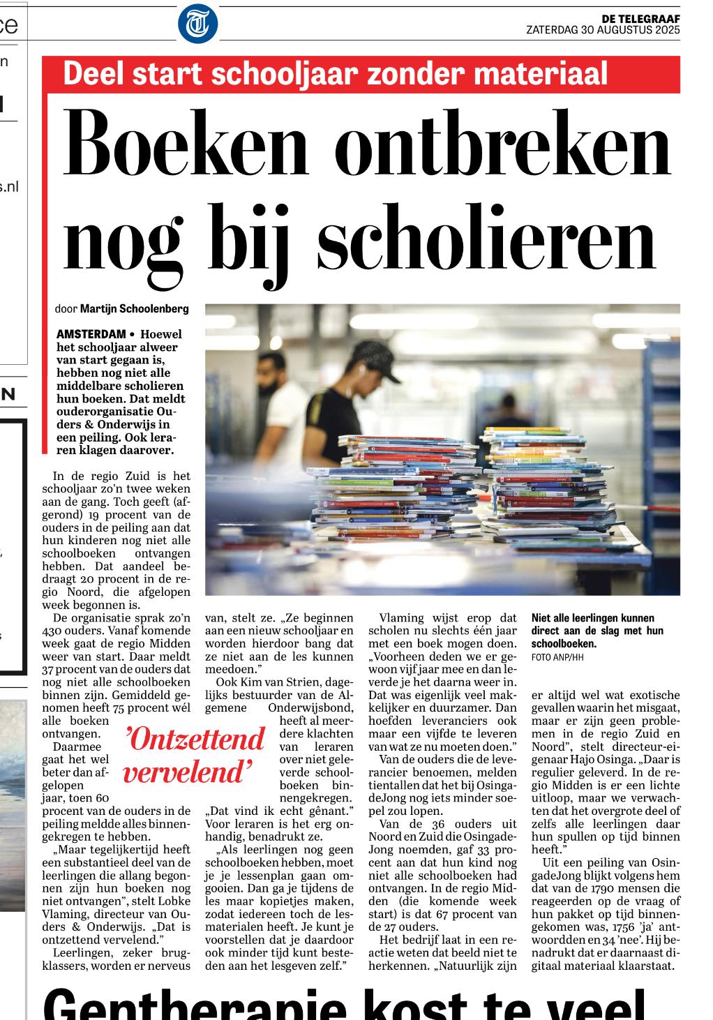 Wij vinden het erg vervelend om te horen dat er bij een collega problemen zijn ontstaan bij de levering van schoolboeken waarover de Telegraaf d.d. 30 augustus schreef. Dat kan veel stress veroorzaken bij leerlingen, ouders, leraren, scholen en natuurlijk ook bij onze collega zelf, zeker vlak voor de start van het nieuwe schooljaar. Wij leven mee en bieden waar nodig graag een helpende hand.